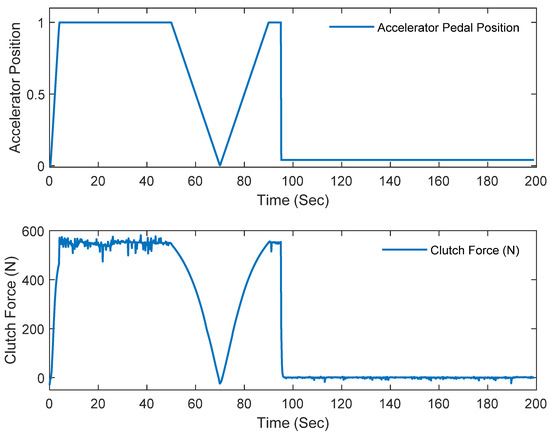 A full cycle test for this controller is conducted and is shown in Figure 12. The accelerator pedal is first pressed to its full position in 3 s. Then, it is kept in this full depression for 50 s. Then, we gradually release it over 20 s. Then, gradually press it again in 20 s. Then, keep it for 10 s. Then release it immediately and totally. The torque transmission between the two plates is stable at 590 N, then changes according to the accelerator position and rate. The clutch is totally disengaged when the accelerator pedal is released.