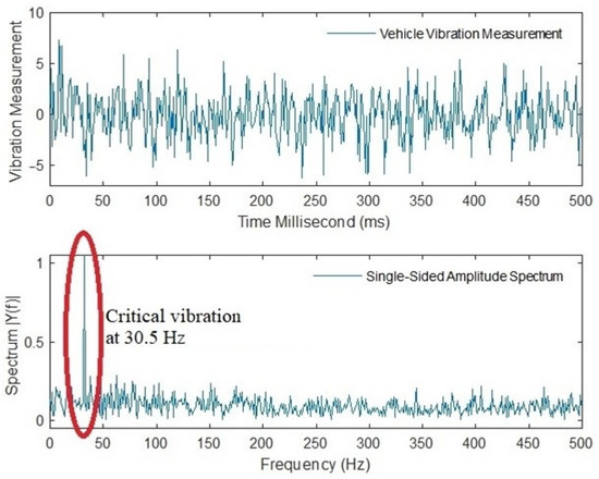 The vibration and noise of the friction clutch can be regulated by the normal force or by changing the clutch pressure. Real experiments show that the vehicle engine has a critical frequency at 30.5 Hz or at the engine angular speed of 1830 rpm, as shown in Figure 13.