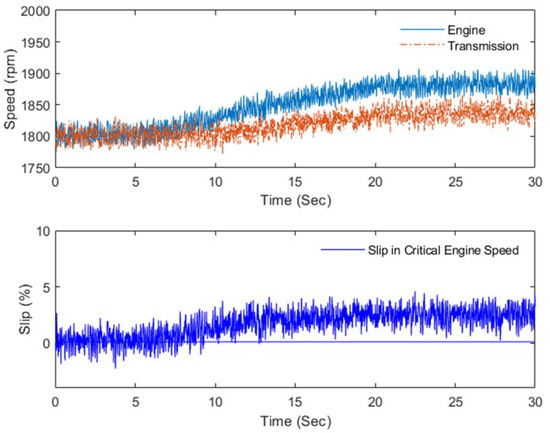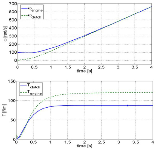 Figure 15 shows that full engagement takes place within 0.9 s when the clutch synchronizes more than 95% of the engine speed. The torque of the engine and the output shaft are kept in a stable condition accordingly.