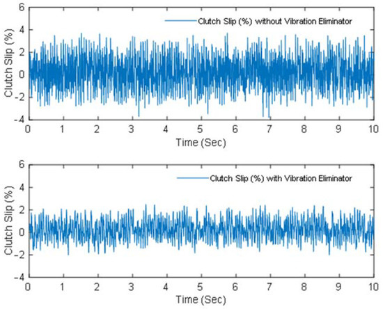 Now the vehicle is maintained, running at a stable speed of 130 km/h for a longer time. Figure 11 shows that, at this stable speed, the torque converter generates less transmission efficiency with a higher slipping ratio of more than 5%. While the slipping ration of the fiction clutch is gradually reduced to less than 1.5% after 100 s. The lower slipping ratio leads to higher torque transmission efficiency and, hence, the vehicle has a higher speed. However, the torque converter provides better damping in a fluid environment and, hence, generates lower vibration and noise. The vibration and noise of a dry clutch can be regulated by regulation of the normal force applied to the two plates and is presented in the next part.