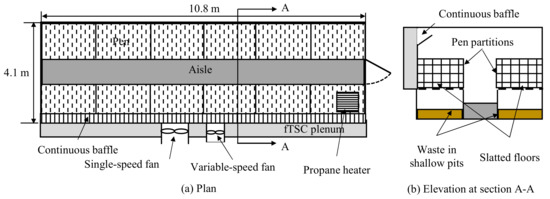 Each nursery room measured 10.8 m W × 4.1 m D × 2.4 m H and had its long axis along east-west. The room had solid sidewalls and insulated drop ceiling. Each room had 12 pens housing 10 piglets per pen with six pens on each side of the sunken aisle (Figure 1); hence, each room housed 120 piglets. The pigs were raised on fully slatted floors with shallow pits below; the pits were flushed out to the anaerobic lagoon for treatment using lagoon supernatant every 4 h between 8 am and 4 pm.