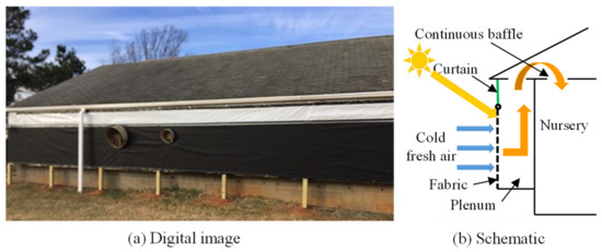 To isolate the effects of direct heating vs. indirect heating (recovery of heat lost through the building envelope), a 0.6 m × 1.5 m piece of insulation (51 mm thick polystyrene foam) (Figure 5) with a thermal resistance of 1.76 m2-C°/W was taped to the sidewall of the nursery. To evaluate the potential of heat storage for use after sundown, a 1.6 m2 piece of PCM mat (BioPCM Q25, total latent heat storage capacity of 60 kJ/m2, activated at 25 °C) manufactured by Phase Change Energy Solutions, was hung in the space between and above the two ventilation fans (Figure 5). Fresh air entering through the fTSC struck the PCM mat, traveled downward parallel to the mat, and then after passing through the 0.15 m gap between the PCM mat and bottom of the fTSC plenum, moved upward between the sidewall and PCM mat before entering the inlet. At plenum temperature ≥25 °C, the PCM would activate, absorbing latent heat, resulting in reduced temperature rise. When the plenum temperature decreased after sundown, the PCM would solidify, releasing heat for use in the barn. The instrumentation and methods used to separate the direct and indirect heating as well as the PCM heat storage effects are discussed in Section 2.3.