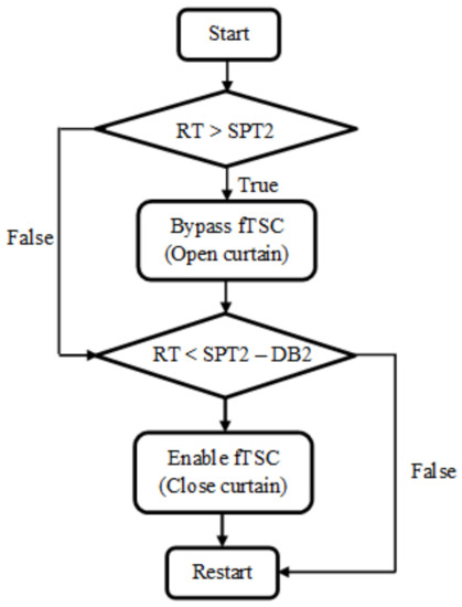 Curtain controller flow-of-logic. Measured room temperature, digital thermostat set-point temperature, and dead-band are denoted by RT, SPT2, and DB2 (1.7 °C), respectively.