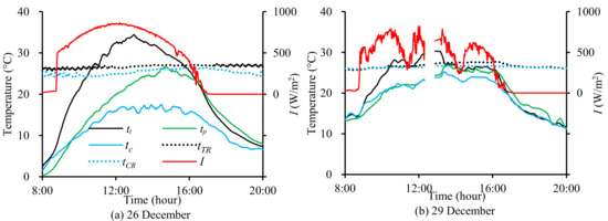 Temperatures (moving averages) and irradiance (I) on (a) 26 December and (b) 29 December 2018 in Trial 1. Legend in Figure 6a indicates plenum temperature as tt; PCM temperature as tp; control temperature as tc; Test room temperature as tTR; and Control room temperature as tCR. Measurements were made every minute. On 29 December data were lost for ~30 min from 12:39 pm.