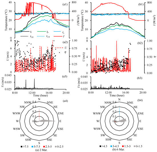 Environmental and operating conditions and fTSC performance on (a) 2 March and (b) 6 March 2019 in Trial 2. Figure 7(a1,b1) present temperature and irradiance (I) data; Figure 7(a2,b2) present wind speed (U) and efficiency (η); Figure 7(a3,b3) present suction velocity (Vs); and Figure 7(a4,b4) present wind roses for the 2 d. Legend in Figure 7(a1) indicates plenum temperature as tt; PCM temperature as tp; control temperature as tc; Test room temperature as tTR; and Control room temperature as tCR. Only temperatures are presented as moving averages. Wind speed data in Figure 7(a4,b4) are in m/s. Measurements and calculations were made every minute. Data for U, η, and, vs. are only presented from 8 am to 5 pm whereas temperature data are from 8 am to 8 pm.