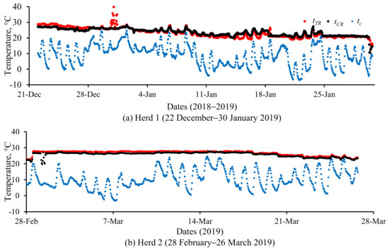 Average hourly Test room (tTR) and Control room (tCR), and Control (tc) temperatures for Herds (a) 1 and (b) 2. Data presented are shorter than the actual durations (Herd 1: 6 December 2018–30 January 2019; Herd 2: 28 February–4 April 2019) due to loss of data.