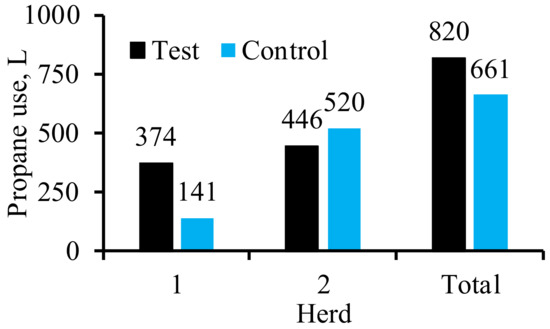 Propane use in the two rooms are compared in Figure 9. Herd 1 was placed on 6 December 2018 but propane data for both rooms is from 12 December when the curtain controller was repaired. Averaged over both treatments, lower propane use in Herd 1 (Figure 9) despite colder conditions (average air temperature of 7.6 °C vs. 9.8 °C) and longer duration (49 d vs. 36 d) vs. Herd 2 was unexpected. The actual duration of Herd 1 was 55 d but propane use during the first 6 d was discarded because the fTSC had not become operational.