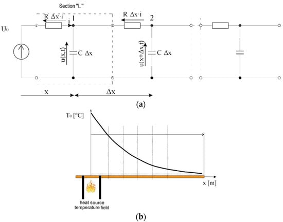 Based on the adopted assumptions, a cable’s thermal system can be presented as an electric quadripole consisting of RC elements [,]. Thermal resistance is modelled by resistance R, and transverse heat losses are represented by capacitance C []. The presented model uses a transmission line variant called the Thomson–Kelvin transmission line, which has the parameters L = G = 0 [,,].
