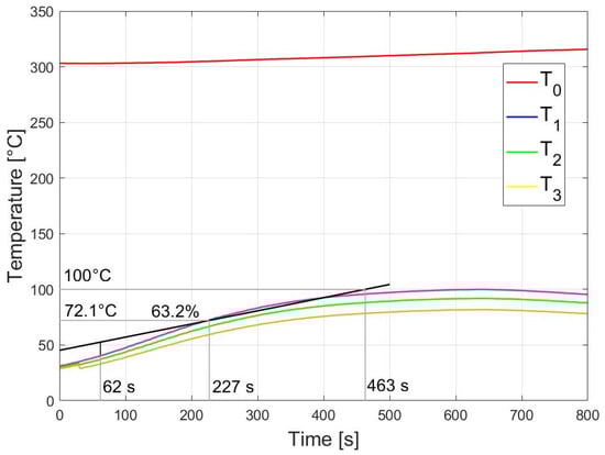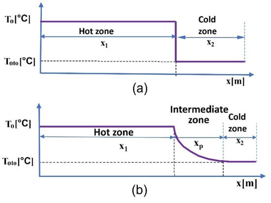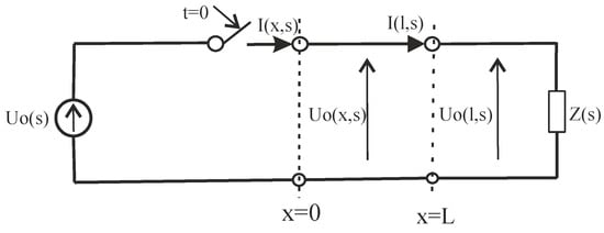 A temperature excitation within the experiment was of a stepwise nature, which, in the case of an electrical system, corresponds to supplying direct voltage to a line with infinite length (Figure 3). Given the assumption that Re[γ(s)] > 0, the Equation (11) reduces to the term .