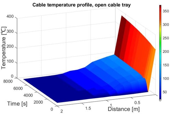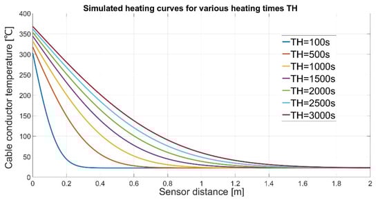 The cable ambient temperature in the course of the conducted tests amounted to 22 °C (±2 °C). A temperature of 22 °C was adopted for the calculations. The time step values can have any tintr interval. The experiment was executed over 7200 s, and the temperature was recorded every 2 s. Implementing the aforementioned data into the modelTerfc.m computation mode enabled us to obtain a family of curves showing the temperature distribution along the longitudinal axis of a non-flammable cable (Figure 5).