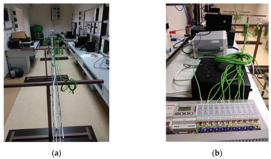 where u(x, t) and i(x, t) are, respectively, the line voltage and current at a distance x from the source; R∆x and G∆x are the resistance and conductance of the elementary line segment; di(x, t)/dt and idu(x, t)/dt are, respectively, the change in the line voltage and current depending on the distance x from the source; u(x + ∆x, t) and i(x + ∆x, t) are the voltage and the current at any point in the line; C∆x du(x, t)/dt is the leakage current on the capacitance between the line cables; and L∆x di(x, t)/dt is the voltage loss due to the magnetic field of the long line. An electrical cable used for the experimental studies was divided into 15 equal elementary segments (Figure 2b). Each elementary segment is shown as a single “L”-type quadripole. For a line shown as a chain of the quadripole, the number increases indefinitely while the parameters of individual quadripoles simultaneously decrease, so it can be concluded that voltage and current at any point of the chain have a waveform similar to the source (forcing) signal.