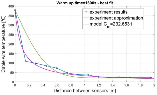 Determining the equivalent heat losses R and C from the cable to the environment is a very important stage for calculating the Terfc(x, t) model determined by Equation (14). They impact the shape of the model temperature curves and the process accuracy of the temperature modelling as a function of time and distance from the heat source [,].