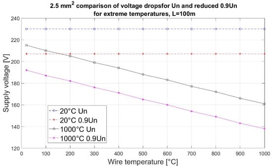 For engineering purposes related to the design of fire protection equipment supply lines, a method of selecting cables for supplying fire protection devices was developed where the total length of the cable was divided into two zones: hot and cold []. The cable in the zone not covered by the fire is under the influence of the ambient temperature or, in extreme cases, the temperature that is permissible for a long period of time and that is caused by the current flow of the permissible value in the cable for a long time. The effect of the fire temperature on the cables is determined by the coefficient of increase in the resistance of the wires kR. The standard provides kR values for various percentages of the hot zone in the total length of the cable. The results obtained in such studies take into account an approximate estimate of the length of the hot zone and the calculation of the relative value of the length of the wire that is most likely to be found in the hot zone. For the cable’s required standard operation time, the expected increase in resistance can be calculated as the arithmetic sum of the resistance of the section classified as the hot zone, and the resistance of the section can be classified as the cold zone. This resistance will always be greater than the resistance related to the normal operating conditions of the section of the electric cable in question.