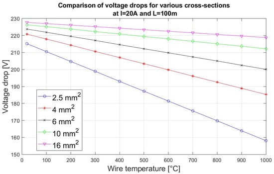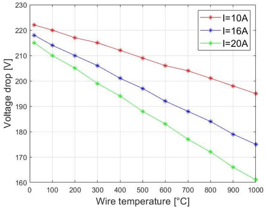 The methodology adopted in the standard [] does not assume the existence of an intermediate zone in which the wire, along a certain length, reaches a temperature that significantly exceeds the permissible values. This does not provide a full picture of the temperature profile of the cable, so it is not sufficient for modelling the heating of the fire protection installations of halogen-free electric cables. Cables within the range of the fire temperature field are subject to heating, which causes an increase in the resistance of the wires and a decrease in the current carrying capacity of the cable, which reduces the transmission capacity of the line supplying the receivers.
