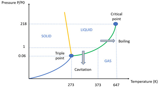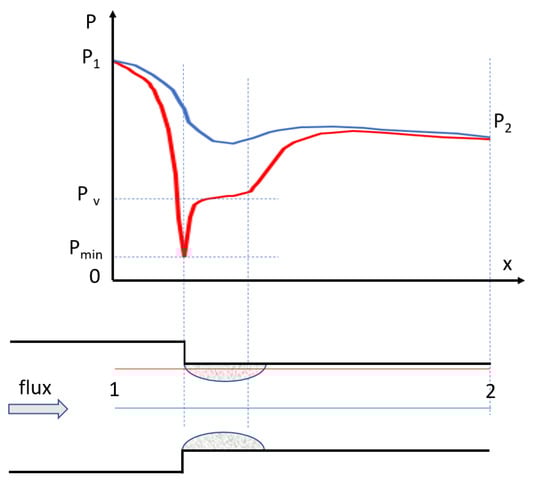 The efficiency of vehicle engines depends on several factors, such as the geometry of the combustion chamber, as well as the reactions that take place there (lubricating oils, etc.). These parameters have been widely studied in recent decades [11,12,13,14,15,16,17,18,19,20,21,22]: production lines are now optimized and these engines are increasingly reliable. However, an important aspect of engine efficiency—combustion—is not yet optimized, since our engines emit unburned gases such as carbon monoxide (CO) and greenhouse gases such as carbon dioxide (CO2) [23,24,25]. In order to reduce the amount of carbon monoxide, it would be necessary to have a combustion with a decrease in unburnt gases; for this, the air-fuel mixture must be optimized [26,27,28]. By remaining on heat engines, in most cases, the fuel is sprayed into fine droplets through an injector, with the latter representing an element that plays a major role in ensuring an optimization of the air-fuel mixture; therefore, influencing the performance of the engine. To vaporize into fine droplets, the fuel must pass through a hole of a few hundred micrometers; thus, creating a strong acceleration of the fuel, due to this throttling, resulting in a sudden local drop in pressure (see Figure 1). This pressure drop can fall below the saturated vapor pressure; thus, causing the phenomenon of cavitation (see Figure 2).