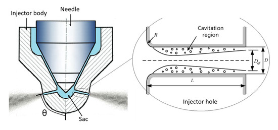 A schematic diagram (see Figure 3) makes it possible to understand the flow of fuel through the injector and to show the different geometric parameters of the injector (radius of inlet curvature R, conicity, effective diameter Deff, L/D ratio, and the angle of inclination of the injector hole θ). In order to limit cavitation in injectors, these geometric parameters are researched to determine the best choice, because the changes in these parameters must correspond to the different flow rates and injection pressures. The injection pressure has an influence on the speed of the fuel and is also an important parameter on the presence of cavitation. The movement of the needle also creates sudden variations in fuel flow that can lead to cavitation. The physico-chemical properties of the fuel play a preponderant role in the phenomenon of cavitation (such properties include viscosity, the saturating vapor pressure that characterizes the pressure below which the liquid is in gas form).