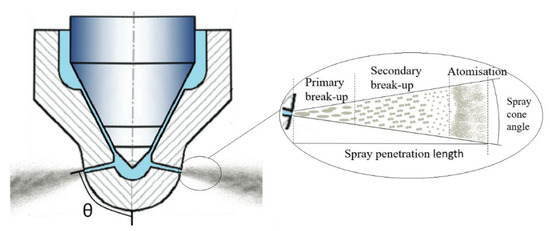 The first stage, called “primary breakup”, transforms the fuel into ligaments or clusters caused by a fuel velocity raised in stagnant air, so that the phenomenon of oscillation at the injector outlet does not exist. Then, these ligaments break into droplets, due to a surface tension lower than the frictional forces of the air—this step is called secondary breakup. Eventually, these droplets evaporate. The spraying phenomenon depends on several parameters, such as injection pressure, ambient pressure, fluid temperature, flow rate, and injector geometry, etc. Thus, the parameters that are essential to be able to characterize the spray are the spray angle, the length of penetration, the Sauter mean diameter (SMD) (giving the diameter of the droplets), the spatial distribution of the droplets, and the discharge coefficient. The greater the spray angle, the better the mixture of the fuel with the ambient air and the shorter the penetration length. The smaller the Sauter mean diameter (SMD), the better the vaporization of the fuel.