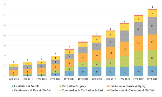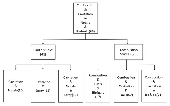 This review paper will focus on the effect of the cavitation phenomenon in a biofuel-powered injector on the efficiency of a turbulent flame. A state-of-the-art review has been made among a selection of the five most important publishers dealing with the field of research including Elsevier, Sage, Taylor and Francis, Springer, and Wiley [51]. To follow the research carried out as part of the characterization of the cavitation phenomenon in industrial and aeronautical applications, a period from 1970 to 2020 has been defined. The terms “cavitation” and “combustion”, representing the basis of the study, were entered into the database of each publisher in the field area “anywhere”. To consider the main biofuels most cited, the keywords “Biofuel”, “Biodiesel”, “DME”, “Oil”, and “Bioethanol” were entered in the “keyword” area. Thus, 2062 articles could be selected from the 5 publishers. To refine the number of articles, a second step was conducted by adding “Injector” or “Nozzle” as the second keyword. This new step led to a selection of 102 articles, of which, following a first reading, 36 had to be rejected because they were too far from the scope of the study. Thus, 66 remaining articles are the subject of this bibliographic study. A distribution of the articles was made according to the theme addressed. Thus, two main groups could be retained, one group according to a fluidic study and another according to a thermal study. Then, each group was developed into several subgroups, as shown in Figure 5. A cumulative distribution of the pertinent articles in the different subgroups, according to the years the papers were published, was made and plotted in a histogram, shown in Figure 6. The first group of fluidic studies, called “Fluidic Studies”, consists of two main subgroups, the first of which is “Cavitation and Nozzle”, in which studies were conducted on the influence of cavitation in an injector on the flow of a fuel. The second subgroup is “Cavitation and Spray”, in which the characteristics of spraying and atomization were studied. A third subgroup was added because some authors conducted a study in the two subgroups. This was named “Cavitation, Nozzle, and Spray”. In the “Combustion Studies” group, the study of the first subgroup, “Combustion, Fuels, and Biofuels”, focused on the comparison of the combustion of fuels and biofuels and their mixtures in terms of engine performance and gaseous releases. The second subgroup deals with the influence of cavitation on the combustion of standard fuels, this is called “Combustion, Cavitation, and Fuels”. Finally, the last subgroup, “Combustion, Cavitation and Biofuels”, deals with the effect of cavitation inside an injector on the combustion efficiency of a flame powered by biofuel.