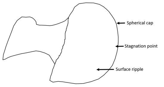 In order to better predict the physical processes involved in the atomization of diesel, biodiesel, and kerosene fuel, Crua et al. [71] carried out investigations near the nozzle outlet, allowing detailed observation of the emergence of the fuel through a long-range microscope. The dynamics of the phenomenon were captured by a fast camera that can render up to 5 million frames per second. It was observed that, in the early moments of spraying, the fluid had a mushroom-like structure that could be preceded by a micro jet (see Figure 7). This form was identified by the author as residual fluid trapped inside the nozzle orifice at the end of each injection. It was noticed that this residual fluid had a movement in the form of an “inner vortex ring”, propelling a microscopic ligament of fuel.