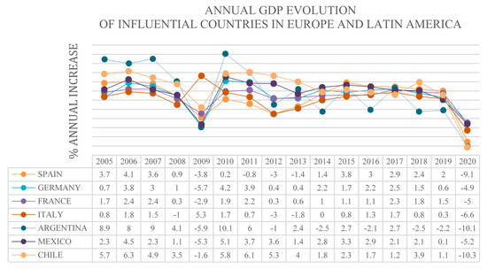 Annual evolution of the GDP (Gross Domestic Product) of influential countries in Europe and Latin America. Data obtained from Eurostat [2] and Cepalstat [3].