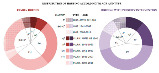 Distribution of the existing residential park according to age and type. Comparison of the family housing stock and the priority intervention stock. Extracted from “Analysis of the characteristics of residential building in Spain in 2011. Volume II. State and regional summary files”, Ministry of Public Works, 2014 [28].