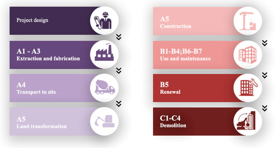 Life cycle of construction materials by stages in ISO 14040. Own elaboration with data extracted from “Study of footprints in the life cycle of the residential building”, Rivero-Camacho C., 2020 [21].