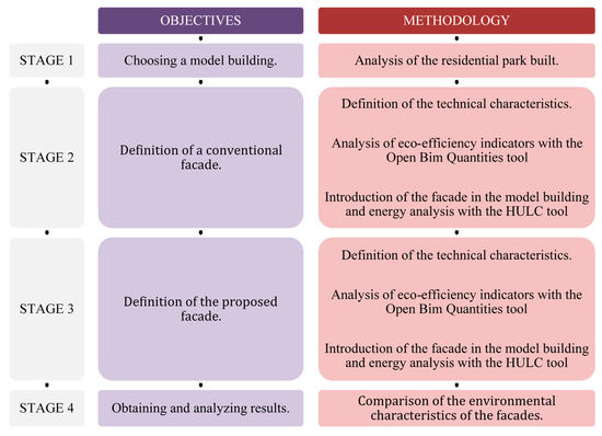 Finally, in stage 4, the results obtained after the development of the analyses is carried out are graphically displayed in order to draw the pertinent conclusions. In this stage, a comparison is made of the characteristics of the enclosure materials, as well as the energy performance and the emissions and waste produced by the materials used.
