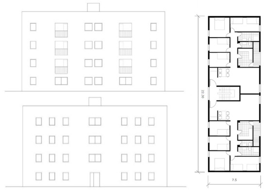 As previously explained, the model building will be located in Spain since it corresponds to a temperate climate (Mediterranean climate). The model building is located in Seville because it complies with the climatic characteristics previously exposed. This building is located in “Polígono San Pablo” and dates from 1962. The building has got 4 floors, with two houses per floor, for a total of 8 houses. It has a rectangular plan with dimensions of 22.30 m wide, by 7.50 m deep. Each house has around 72 m2 of living-dining room, kitchen, laundry room, bathroom, toilet, four bedrooms, and distribution space, as shown in the planimetry in Figure 5.