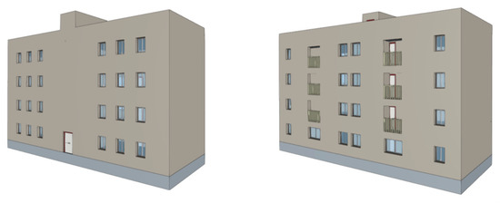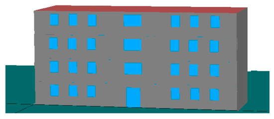 The composition of the building’s constructive elements is defined using the CYPE Price Generator database [36]. The energy consumption values and the CO2 emissions of the products are analyzed. A study is carried out to analyze the energy performance of building with the different facades. This analysis is carried out through the monitoring of a model building using the LIDER/CALENER Unified Tool (HULC) [37], which report with the energy certification of the buildings. The location of the building is essential for the development of energy analysis. A hypothetical situation is proposed in which the model building has no buildings around it. This fact affects when calculating, since they act as shadow elements. Once all these data have been entered, the model shown in Figure 7 is obtained.