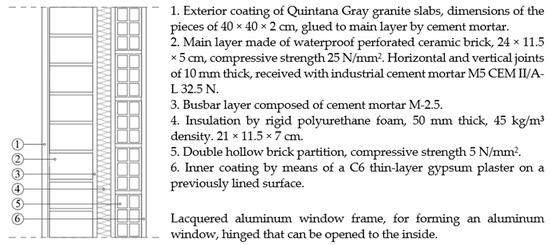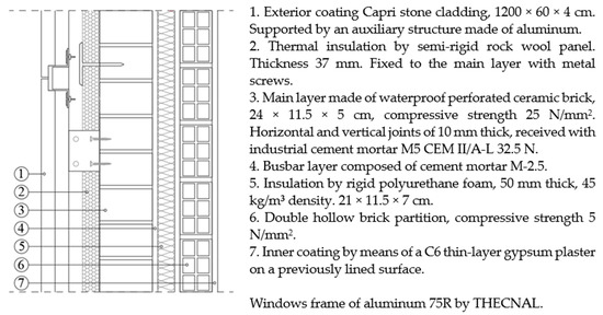 Section of conventional facade. Material definition according to BCCA [41] and construction price generator—CYPE Engineers [36].
