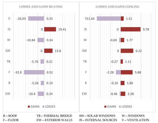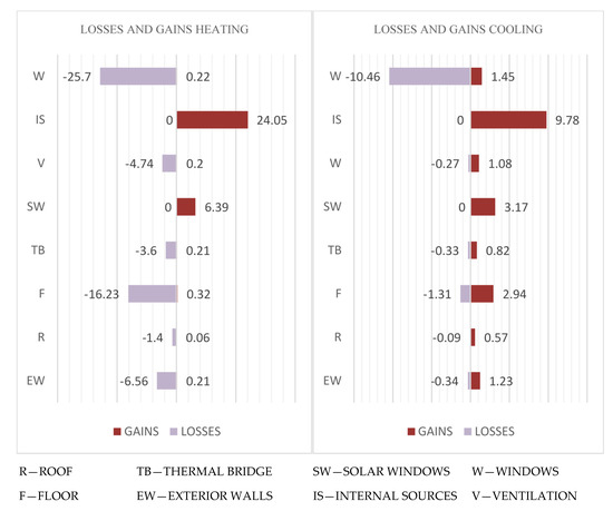 Distribution of gains and losses for heating with the conventional facade (left) and cooling (right). Extracted from the “LIDER-CALENER Unified Tool”.
