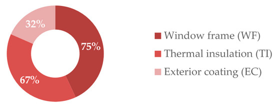 Finally, the percentage of recycled product contained in the elements that make up the facade for rehabilitation is analyzed. The values corresponding to the conventional façade are not included in the graph corresponding to Figure 11, since in all cases the percentage is zero.