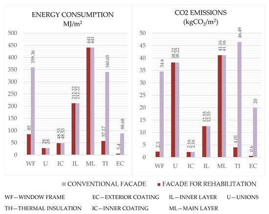 Appendix A includes the calculations performed to obtain the data from the first two columns of the upper table. In the case of the components that make up the rehabilitated facade, they are specific materials whose energy consumption and CO2 emission values have been taken from the Environmental Product Declaration of the materials. The most unfavorable value of energy consumption is presented by window frame, with 85.00 MJ/m2, while in the case of CO2 emissions, it has a value of 2.30 kgCO2/m2. On the other hand, thermal insulation consumes 57.17 MJ/m2 in its manufacturing process and emits 4.01 kgCO2/m2. Finally, stone cladding has the lowest energy consumption and CO2 emissions values.