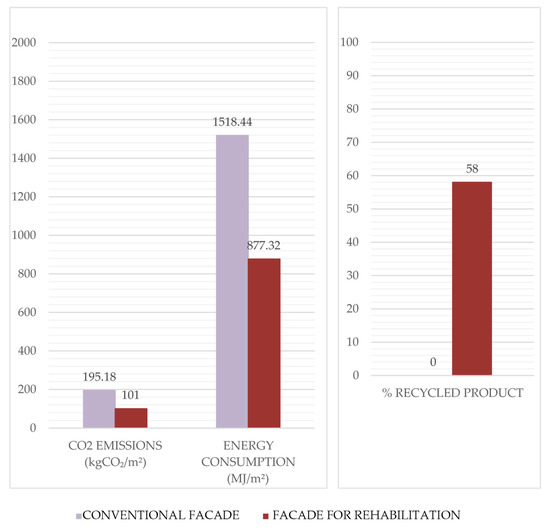A comparison is made between the facades from the point of view of sustainability and eco-efficiency in order to ensure that the rehabilitation proposal involves environmental improvements compared to the conventional façade, you can see in Figure 13.
