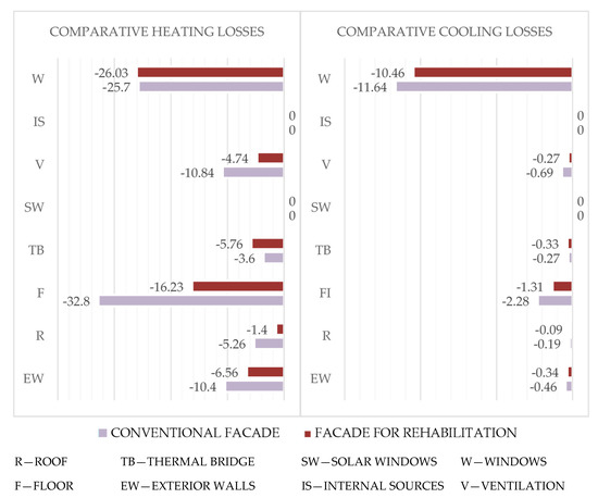 The total heating losses is −88.50 kWh/m2·year. The facade has a loss of −10.40 kWh/m2·year, this is equivalent to 12% of the total heating losses. Windows are a critical point on the facades of buildings, it is verified that the losses in this element are quite high. On the other hand, the gains in the facade are mainly attributed to the openings, with a 13.80 kWh/m2·year. With regard to cooling, the total losses are much lower, −15.53 kWh/m2·year. Approximately 3% of the losses correspond to the exterior walls.