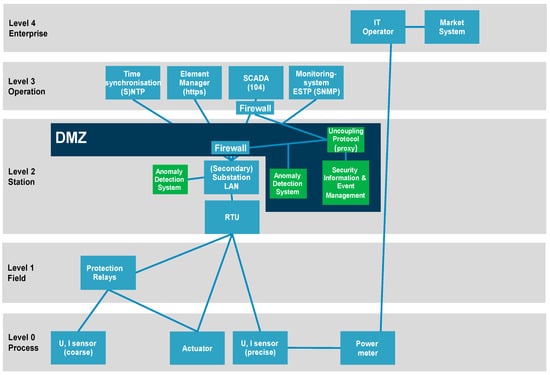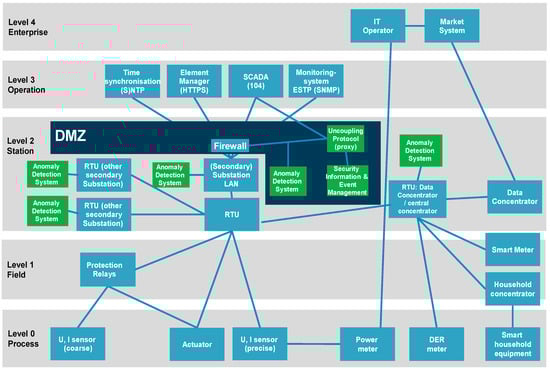 In the future, SG will evolve in an even more intelligent environment where the remote devices in substations will communicate with each other. An example is the self-healing ring concept that makes it possible that the network itself will heal after a malfunction in the medium voltage meshed or ring networks (e.g., a cable cut). This brings extra challenges for the security application because the IEDs will communicate directly without consulting the SCADA. After restoration, the SCADA system needs to be informed of the new medium-voltage network status [41]. In this case, an AI-based approach needs to follow up on the monitoring and control messages between the IEDs and the SCADA system. The future SG needs updates in the environment of station level, typically in the layer where the aggregation devices are found that communicate to the SCADA systems. Special attention is paid to security architecture [42]. As shown in the example below, the demilitarized zone (DMZ) needs to be defined, the communication messages that flow to and from the different devices and to and from the SCADA system must be identified, described, and, in the end, this information and the intelligence on how to act after an anomaly detection has to be programmed in ADS. This also means that these enhanced ADSs need to be adapted, tested and implemented.