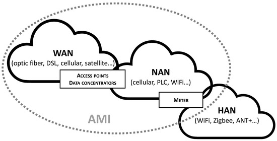 A three-level hierarchy can be defined to support an SG communications network. It includes the home area network (HAN), neighborhood area network (NAN), and wide area network (WAN). An overview of the AMI communication scheme is shown in Figure 5.