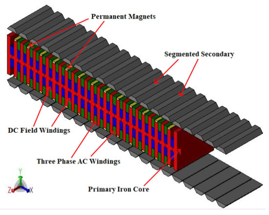 Existing long stroke linear motion applications such as electric train and vertical lifting utilize rotatory machines plus Mechanical Conversion System (MCS). Two important problems of existing traction system can be highlighted as; (1) the installed rotatory motors are either DC series traction motor, induction motor, or newest traction system utilizes synchronous machines. DC series traction motors are excited by DC rotor bars and brushes are utilized to deliver electric power. This commutator section results in increased maintenance cost and sparking may lead to fire/faults [1]. Induction motor shows demerits of complex speed control, low starting torque, and low efficiency at low loads due to low power factor [2]. Synchronous machines result in high efficiency, constant speed, high power factor, and high torque density. However, placement of field system (PMs or electromagnets) at the rotor reduces its mechanical integrity at high speeds [3]. Furthermore, increased cost of rare earth material in case of Permanent Magnet Synchronous Machine (PMSM) and due to increased maintenance cost of collector rings and brushes in case of field excited synchronous machines forced electrical machine designers to investigate new topologies [4]. Second, MCS is required to convert rotating torque into linear thrust force, as linear translational motion is expected in case of electric train. MCS is meshing engagement of motion type conversion mechanical devices such as ball screw, lead screw and rack, and pinion, etc. This combination results in noise, vibration, mechanical power transfer loss, gearbox faults, and regular maintenance problems [5].