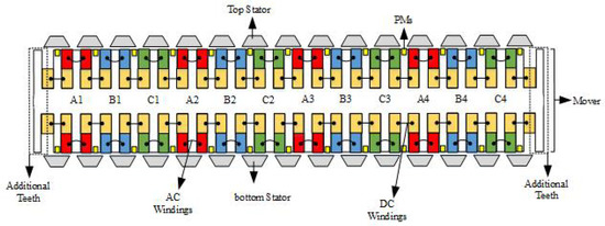 Three dimensional illustration and two dimensional diagram of proposed machine is shown in Figure 2 and Figure 3, respectively. Mover teeth , number of DC windings or PMs , AC windings , and stator to mover pole pitch of the proposed machine are derived utilizing following design guidelines equations [17]: