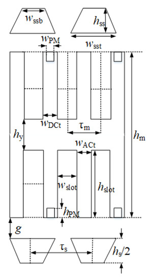 Here, is used to represent number of AC phases and that reflects AC winding coil pair repetition in the machine. Aforementioned guidelines resulted in and leading to . Initial values of structure parameters are tabulated in Table 1 and their definitions are provided in Figure 4.