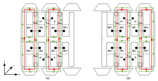 Two types of explanation techniques (air-gap field modulation theory [18,19] or magnetic equivalent circuit) can be utilized to understand operation principle of proposed machine. Magnetic Equivalent Circuit (MEC) methodology is adopted in this paper to reduce complexity. Positive max. and negative max. of no-load flux linkage obtained during linear displacement of one stator pole pitch are shown in Figure 5a,b, respectively. Red lines indicate flux flow generated due to PMs and makes series magnetic circuit encompassing two stators and complete mover. Flux represented by green lines is due to DC electromagnets and make combination of two parallel magnetic circuits and also follow PM flux flow paths. Both PM and DC electromagnets’ flux follow same paths to ensure philosophy of hybrid excitation.