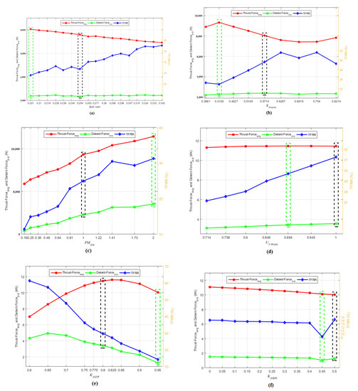 It can be verified from Figure 6f that all three KPIs shows lower gradient negative slope graph with increase of SSBW optimization coefficient. However, a sudden dip in the peak-to-peak detent force and TFRR profile is witnessed at SSBW optimization coefficient of 0.45. Numerical values of average thrust force, peak-to-peak detent force, and TFRR at SSBW optimization coefficient of 0.45 and SSBW of 12.825 mm are 10,111.13 N, 1028.83 N, and 9.15%.