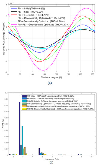 No-load flux linkage comparison: (a) waveforms and (b) frequency spectrum.