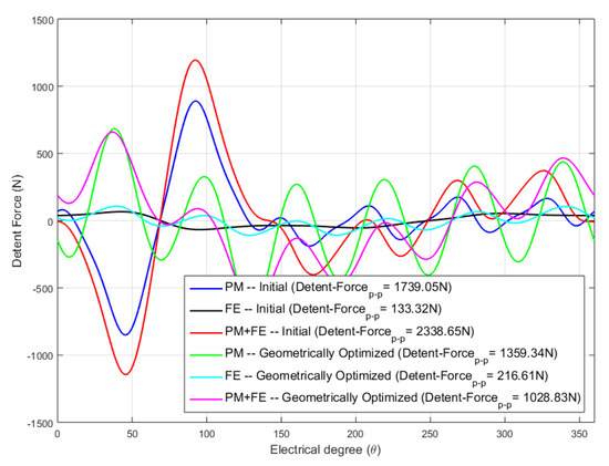 Comparison of detent force profile under all three excitation sources combinations for initial HELFSM and geometrically optimized HELFSM is presented in Figure 9. As detent force is an undesired property, it causes ripples in the thrust force profile, and affects machine’s positioning precision [20], hence its peak-to-peak value must be reduced after optimization process. While comparing initial and optimized machine configurations, peak-to-peak values of detent force due to only PMs excitation is reduced from 1739.05 N to 1359.34 N and due to PMs + DC is reduced from 2338.35 N to 1028.83 N. However, a slight increase in the peak-to-peak detent force values due to only DC excitation is observed, its value is increased from 133.32 N to 216.61 N.