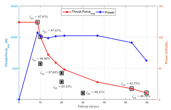 Average thrust force and power versus velocity.