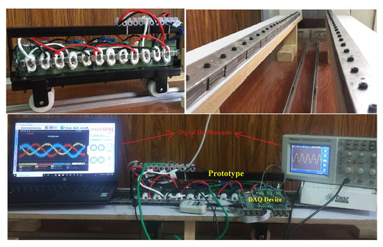After recognition of geometric parameters delivering maximum average thrust force and lowest TFRR, a prototype proposed machine having stroke length of two meters is manufactured (as shown in Figure 13). Electrical steel (35H210) for mover and stator core, NdFeB (Neomax-35AH) for PMs, and SWG 18 copper conductor for windings Measured resistance and inductance of each AC phase is 0.7 ohm and 0.99 mH, respectively, whereas that of DC coil is 2.1 ohm and 7.5 mH, respectively.