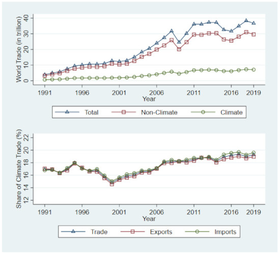 Trends of International Climate, non-climate, and Total Trade. Note: Authors’ calculation by using the UN Comtrade data. Source: UN Comtrade. International Trade Statistics-Import/Export Data (accessed on 8 May 2021) [36].