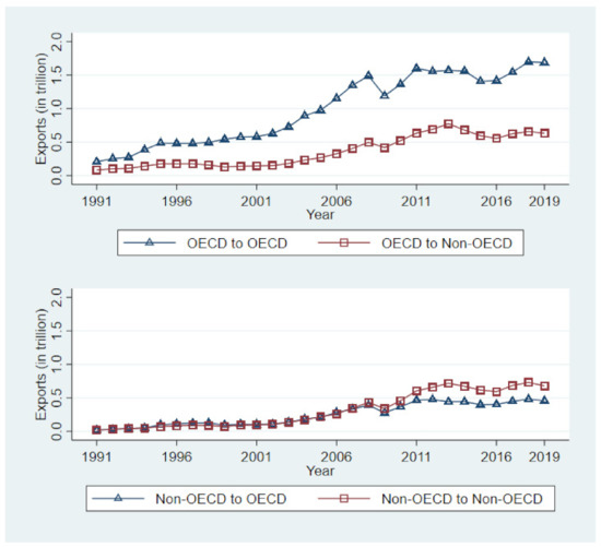 In Figure 3, we plotted the volume of bilateral trade between OECD and non-OECD countries. On 14 December 1960, 20 countries originally signed the Convention on the Organization for Economic Cooperation and Development (OECD). There are now (as of 2021) 38 member countries in the OECD. The volumes of bilateral climate exports between countries show increasing and steady trends from 1991 to 2019. The trends in bilateral climate exports from the perspective of OECD countries are shown in the upper panel of Figure 3. The value of climate exports of OECD to OECD countries increased from US$ 0.21 trillion in 1991 to US$ 1.69 trillion in 2019. The climate exports from OECD to non-OECD countries increased from US$ 0.08 trillion in 1991 to US$ 0.63 trillion in 2019, where the gap with the climate exports between OECDs gradually increased. This indicates that OECD countries were relatively competitive in the climate industry compared to non-OECD countries.