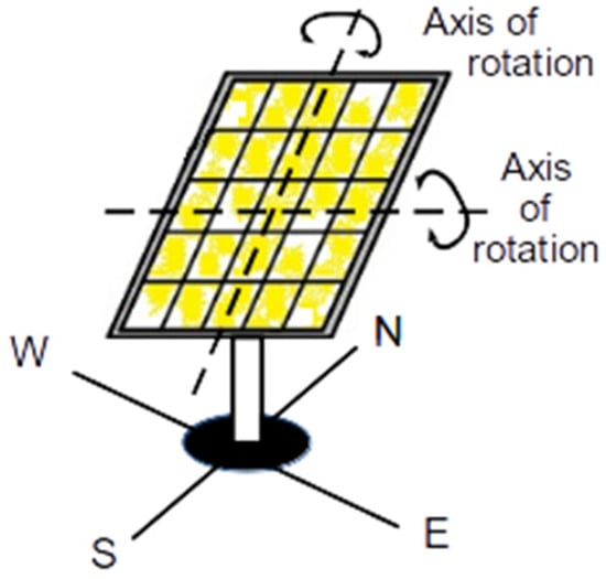 One of the problems associated with PV generators is the low efficiency [3], so it is extremely critical to ensure the maximum possible production. There are several factors that influence the production of the electrical energy from a PV panel, some being factors associated with the solar irradiation level, like the temperature of the PV panel, the wind velocity and the dust on the panels [4,5]; some of these factors are interrelated. For example, irradiance and dust have the same effect since if there is dust on the PV panel surface the irradiation is reduced. The same applies for wind and temperature, as when wind velocity increases, the temperature of the PV panel is reduced. However, to ensure the maximum solar irradiation, a fundamental aspect is related to the position between the PV modules and the brightest point in the sky. To ensure these conditions, several aspects should be considered, like the PV panels’ geographic location and the position of the sun [6]. In this way, the use of trackers associated with the PV panels play a very important role. Since this component has the ability to track the best position of the PV panels in relation to the sun, its use allows an important boost of the produced energy to be obtained [7]. Depending on the geographic location, the increase in the total yield that can be obtained by the sun tracking system can achieve values of up to 40% [8]. So, many solar power plants have adopted their use. There are two types of solar trackers: the single-axis and the dual-axis. The single-axis solar tracker panels rotate around a fixed axis [9]. In the case of the dual-axis trackers, the solar panels will move around two axes (Figure 1). Due to this, the solar panels can move in any direction and the best position of those panels in relation to the sun can always be achieved [10]. So, the increase in the yearly specific yield (generated power per unit of area) using solar tracking with the right tilt angle and direction are becoming more and more important. Some studies analyzed the positioning features of polycrystalline (p-Si), monocrystalline (m-Si) and amorphous silicon (a-Si) modules relative to the visible focus point of a reference concentrator photovoltaic module, under real meteorological conditions, using a dual tracking system [11,12]. These studies showed that the performance insensitivity thresholds of m-Si, p-Si and a-Si modules depended on the direction of the changes.