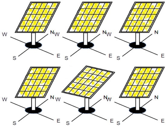 Although the use of trackers allows the optimization of PV systems regarding the maximum energy production by the PV panels, they will introduce more complexity to the system by which they will be subject to new failures. In fact, these trackers consist of several components and systems that are prone to failure, such as motors, motor drive, controllers and sensors [13]. In this way, a failure in one of these components will greatly affect the energy generated by the PV panels since it will not ensure that their orientation will be at the brightest point in the sky. Due to the cost of the trackers, usually they are used in large systems, like PV and thermal solar power plants. So, due to the high number of these systems, usually the identification of a fault in a tracker can be complex and long. According to previous studies [16,37,38], operators often just visualize the daily gain of the plant, in order to obtain an impression of the amount of energy produced. Even dedicated software systems for monitoring renewable power plants are often limited to features like storing and visualizing measurement data [39]. Analysis algorithms used in practice, often are just simple threshold calculations. In this way, malfunctions that appear in the PV power plant that do not lead to an immediate total power loss, may go unnoticed for a long time. To speed up this process, a SCADA system and many sensors to monitor numerous parameters can be installed in PV plants. Thus, the use of images to detect this kind of fault becomes much more simple and easy to implement. On the other hand, due to the existence of several PV systems, a pattern recognition method can be implemented through the comparison between them. So, considering that the number of PV systems with a fault in a tracker is in a much lower number of PV systems (usually a single one), the detection of a fault can be implemented through the comparison of the slopes between them (Figure 2). In reality the orientation of the PV systems with no fault in the tracker will be exactly the same since they are oriented to the sun. However, the one with a fault in that system will present a different orientation. In this way, analyzing the orientation of the PV panels’ slope, if there is one or more (but the minority) with a different orientation of the healthy, then that (or those) PV system(s) has a fault in the tracker.